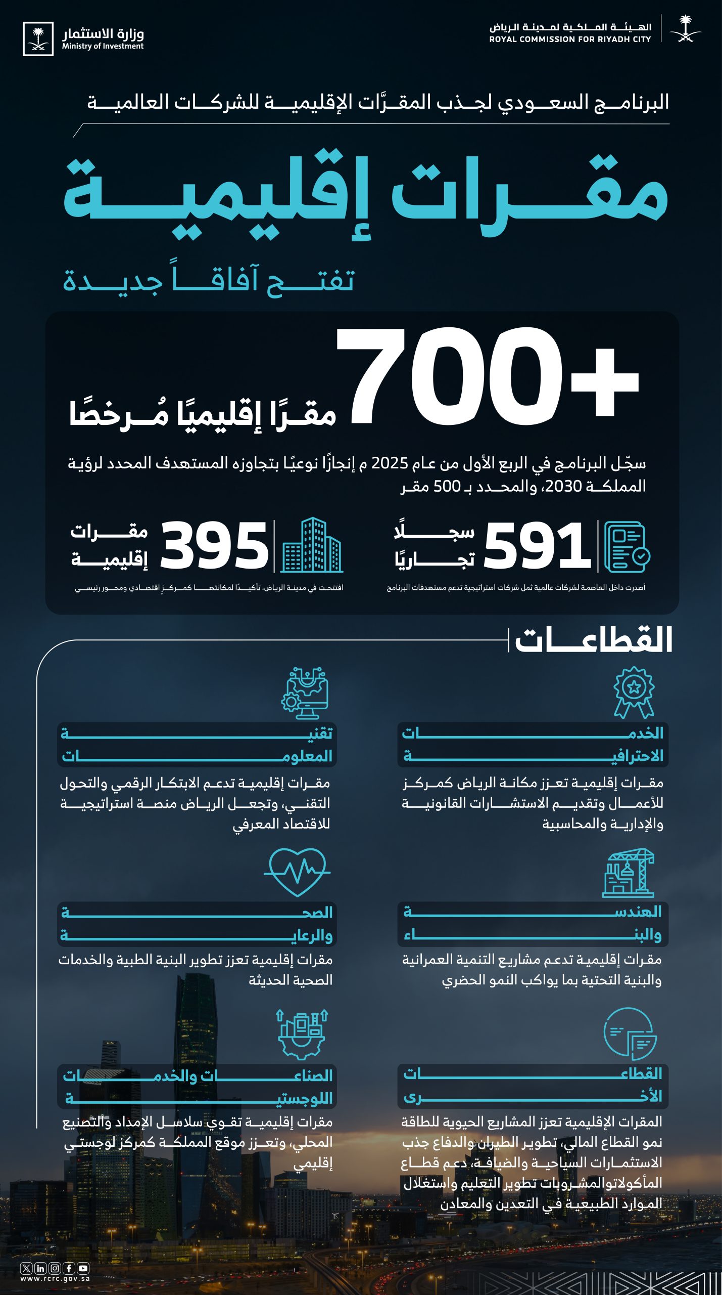 استطاع البرنامج تجاوز العدد المستهدف من المقرَّات لعام 2030م، والمقدَّر بـ(500 مقر)، ونجح في جذب أكثر من 700 شركة عالمية بنهاية عام 2025م، واستقطاب عدد من المدارس العالمية؛ لدعم عائلات موظفي المقرَّات الإقليمية، وتعزيز الربط الجوي الدولي؛ عبر إضافة وجهات جديدة تدعم حركة الأعمال.
