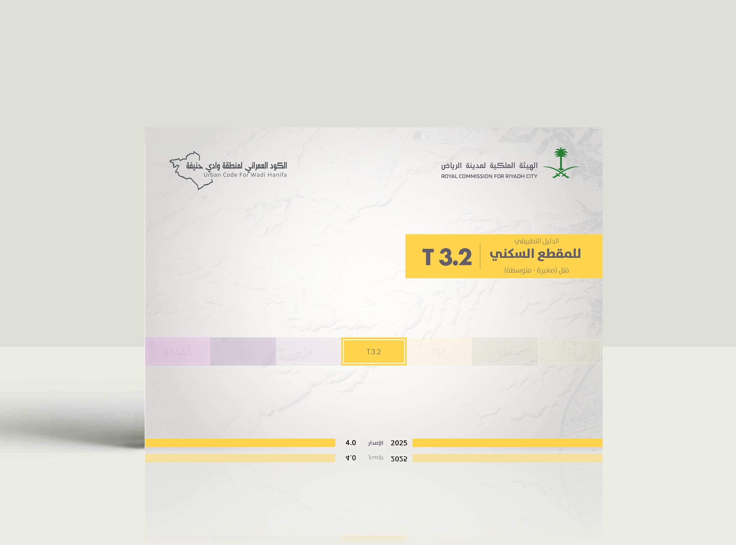 يقدم T 3.2 الدليل التطبيقي للمقطع السكني فلل (صغيرة – متوسطة) من الكود العمراني لوادي حنيفة وروافده والأراضي المطلة عليه تفاصيل حول أنماط التطوير المتاحة واشتراطات التطوير وضوابط البناء الخاصة بالفلل الصغيرة والمتوسطة، بما يشمل متطلبات الفناء الداخلي، الارتفاعات، الأسوار، تصميم الأرصفة، بالإضافة إلى الأحكام العامة، الحالات الخاصة، والموجهات التصميمية.