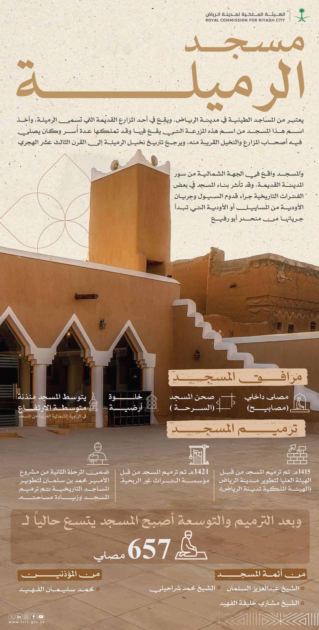 يعتبر من المساجد الطينية في مدينة الرياض، ويقع في أحد المزارع القديمة التي تسمى الرميلة، وأخذ اسم هذا المسجد من اسم هذه المزرعة التي يقع فيها، وقد تملكها عدة أسر وكان يصلي فيه أصحاب المزارع والنخيل القريبة منه، ويرجع تاريخ نخيل الرميلة إلى القرن الثالث عشر الهجري.
